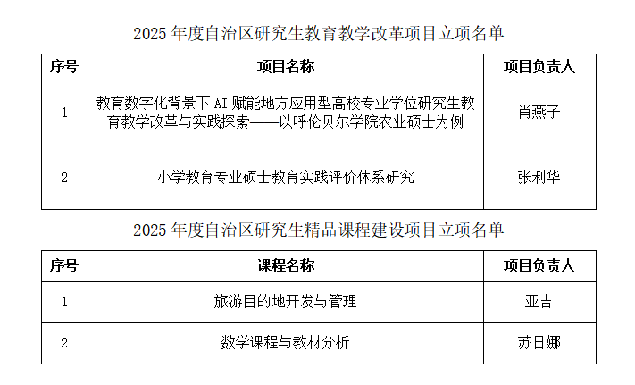 近日,根據《內蒙古自治區研究生教育教學改革項目管理辦法》《內蒙古自治區研究生精品課程建設項目管理辦法》等有關規定,自治區教育廳組織專家對各單位推薦申報的研究生教育項目進行評審。經嚴格評審,我校肖燕子、張利華兩名教師獲批自治區研究生教育教學改革項目;亞吉、蘇日娜兩名教師獲批自治區研究生精品課程建設項目。