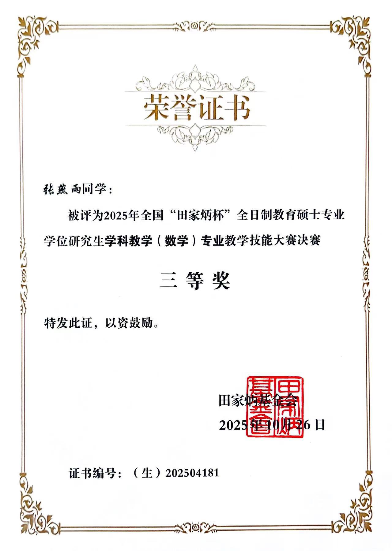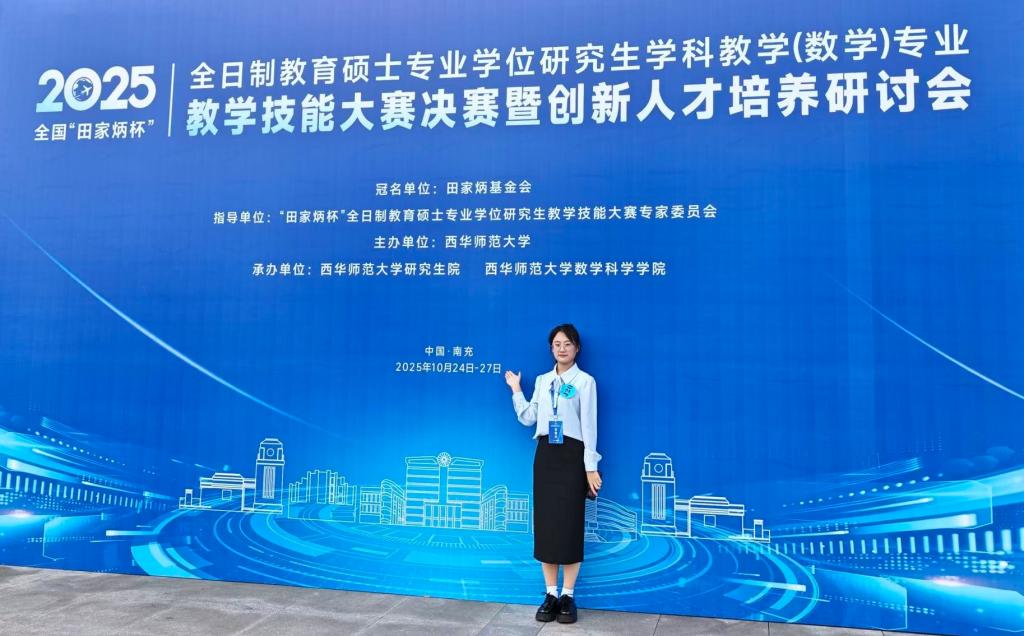 10月24日至27日,2025年全國“田家炳杯”全日制教育碩士專業(yè)學(xué)位研究生學(xué)科教學(xué)(數(shù)學(xué))專業(yè)教學(xué)技能大賽暨創(chuàng)新人才培養(yǎng)研討會在西華師范大學(xué)舉行。我校數(shù)理學(xué)院2023級教育碩士學(xué)科教學(xué)(數(shù)學(xué))專業(yè)研究生張燕雨在決賽中憑借出色的現(xiàn)場表現(xiàn)榮獲大賽三等獎。
