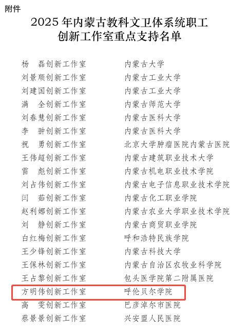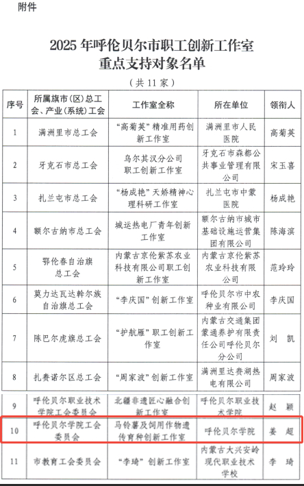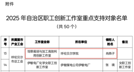 近日,我校肖燕子領銜的飼草栽培與加工高效利用創新工作室榮獲2025年度內蒙古自治區總工會重點支持職工創新工作室、方明偉創新工作室入圍內蒙古自治區教科文衛體系統2025年重點支持職工創新工作室名單、姜超創新工作室獲批2025年呼倫貝爾市總工會重點支持的創新工作室。此次3項榮譽的斬獲,既是對我校工會職工創新工作的高度認可,更標志著我校在服務地方發展、深化教學科研改革、凝聚職工創新活力方面邁出了堅實步伐。截至目前,我校已擁有自治區級創新工作室2個、自治區教科文體工會系統創新工作室2個、市級創新工作室5個,形成了多層次、全覆蓋的職工創新培育體系。