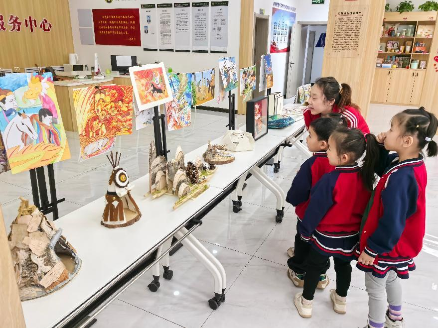 美術學院師生以“北疆文化”展示區為載體,構建起沉浸式美育空間。活動通過海報、展板等視覺媒介,以信息為載體,成為傳播民族團結理念的“美育微課堂”。蒙古族馬鞍、馬鞭等傳統器具作為物質文化符號,經藝術化陳列與情境化敘事,實現從“靜態展品”到“文化讀本”的轉化。圖文展通過數字繪畫、平面設計等藝術形式,將蒙古馬精神、“三北精神”進行視覺化轉譯,使抽象的精神內核具象為可感知、可傳播的文化圖像。學生志愿者認真講解展品背后的民族文化基因,引導居民在審美體驗中感受各民族文化的共生關系,實現“以美啟真”的認知提升。