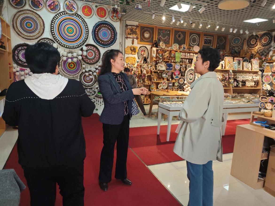 座談結(jié)束后,白秀峰一行實地參觀了鄂溫克旗非遺傳習所、呼倫貝爾市兀傲文化發(fā)展有限公司、“太陽姑娘”工作室等。在參觀過程中,非遺傳承人、手工藝匠人們詳細介紹了傳統(tǒng)皮具、民族繪畫、手工藝品等多個非遺項目的類型、材質(zhì)、制作流程和獨特工藝,讓白秀峰一行對鄂溫克旗非遺項目有了更直觀的認識。