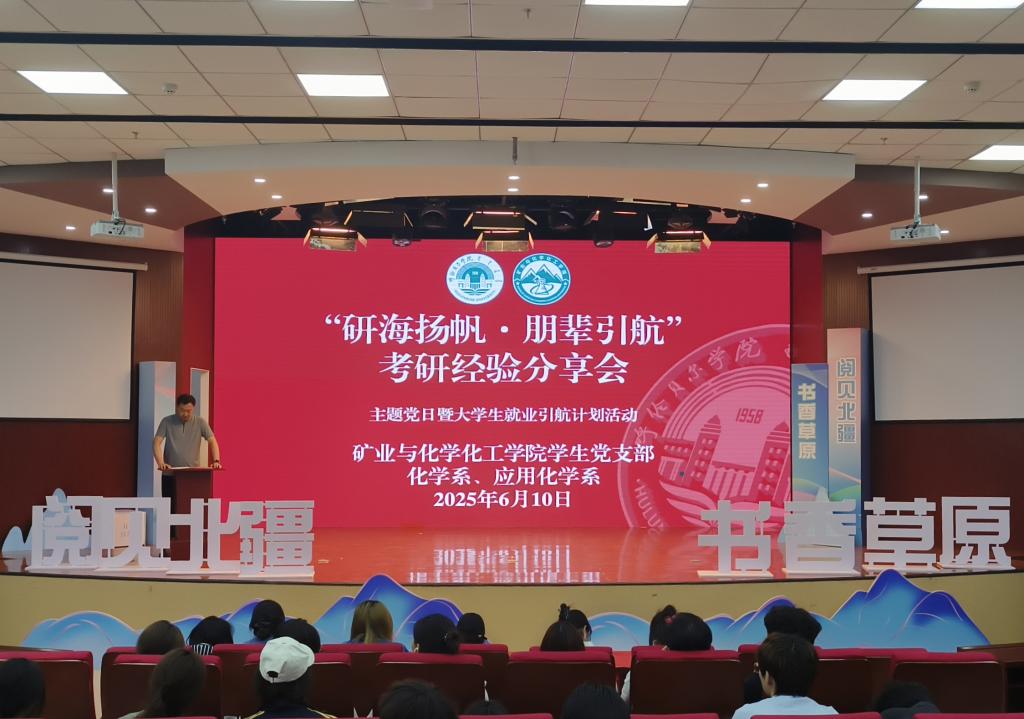 為進一步強化學生學業職業規劃意識,進一步發揮榜樣的示范引領作用,幫助學生及時做好考研規劃,助力良好學風氛圍的形成,6月10日下午,礦業與化學化工學院學生黨支部聯合化學系、應用化學系舉辦“研海揚帆·朋輩引航”考研經驗分享主題黨日暨“大學生就業引航計劃”活動。5名已成功考取研究生的2025屆優秀畢業生化身“備考導師”進行了現場交流分享。學生黨支部書記孟慶永、化學系主任齊霞、應用化學系主任李靜、專業課教師黃媛及學生黨支部黨員、發展對象、入黨積極分子及相關專業學生共計80余人參加了活動。活動由孟慶永主持。