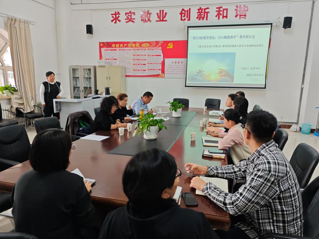 10月10日下午,蒙古學學院在崇文樓B221教室舉辦“AI賦能教學創新,共探創新路徑”專題教研活動。活動聚焦人工智能技術與專業課程的深度融合,學院副院長小花、中國少數民族語言文學專業系主任包薩如拉、教師文慧分別作專題分享,學校教學督導組專家全程參與并給予專業點評。