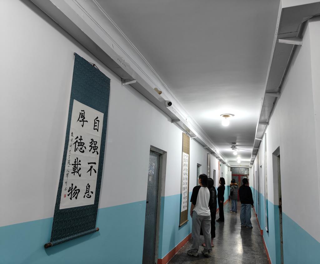 走進6號宿舍樓,原本靜謐樸素的樓道煥發出嶄新的生機與活力。一幅幅主題鮮明、形式多樣的藝術作品錯落有致地陳列于墻面,或筆走龍蛇的書法作品剛勁有力,或色彩明麗的繪畫作品意境深遠。這些作品均出自美術學院師生之手,既有對紅色經典的深情致敬,也有對時代精神的創新表達,字里行間皆是信仰的回響,筆墨丹青之中盡顯初心的力量。