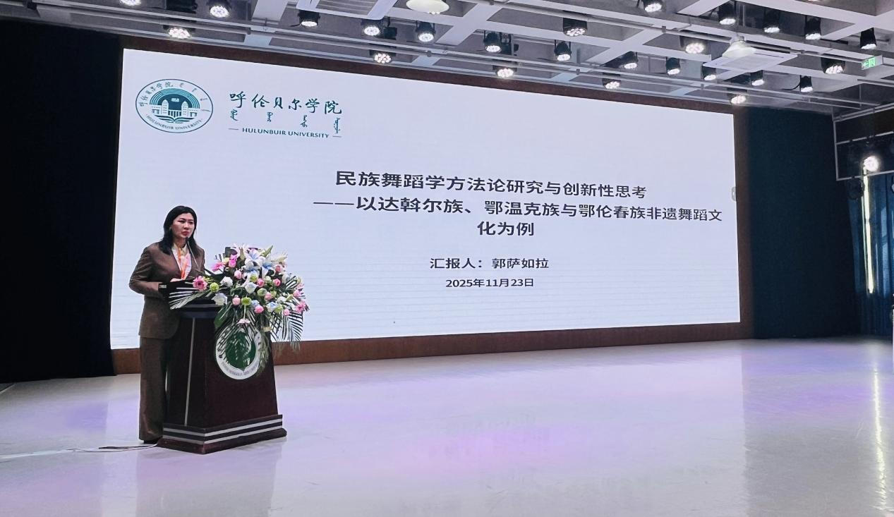 23日上午,郭薩如拉以《民族舞蹈學方法論研究與創(chuàng)新性思考——以達斡爾族、鄂溫克族與鄂倫春族非遺舞蹈文化為例》為題作專題匯報。她的匯報聚焦北疆地區(qū)獨具特色的達斡爾族、鄂溫克族與鄂倫春族非物質(zhì)文化遺產(chǎn)舞蹈,從方法論層面深入探討民族舞蹈學研究的新路徑,并提出富有建設性的創(chuàng)新思考。