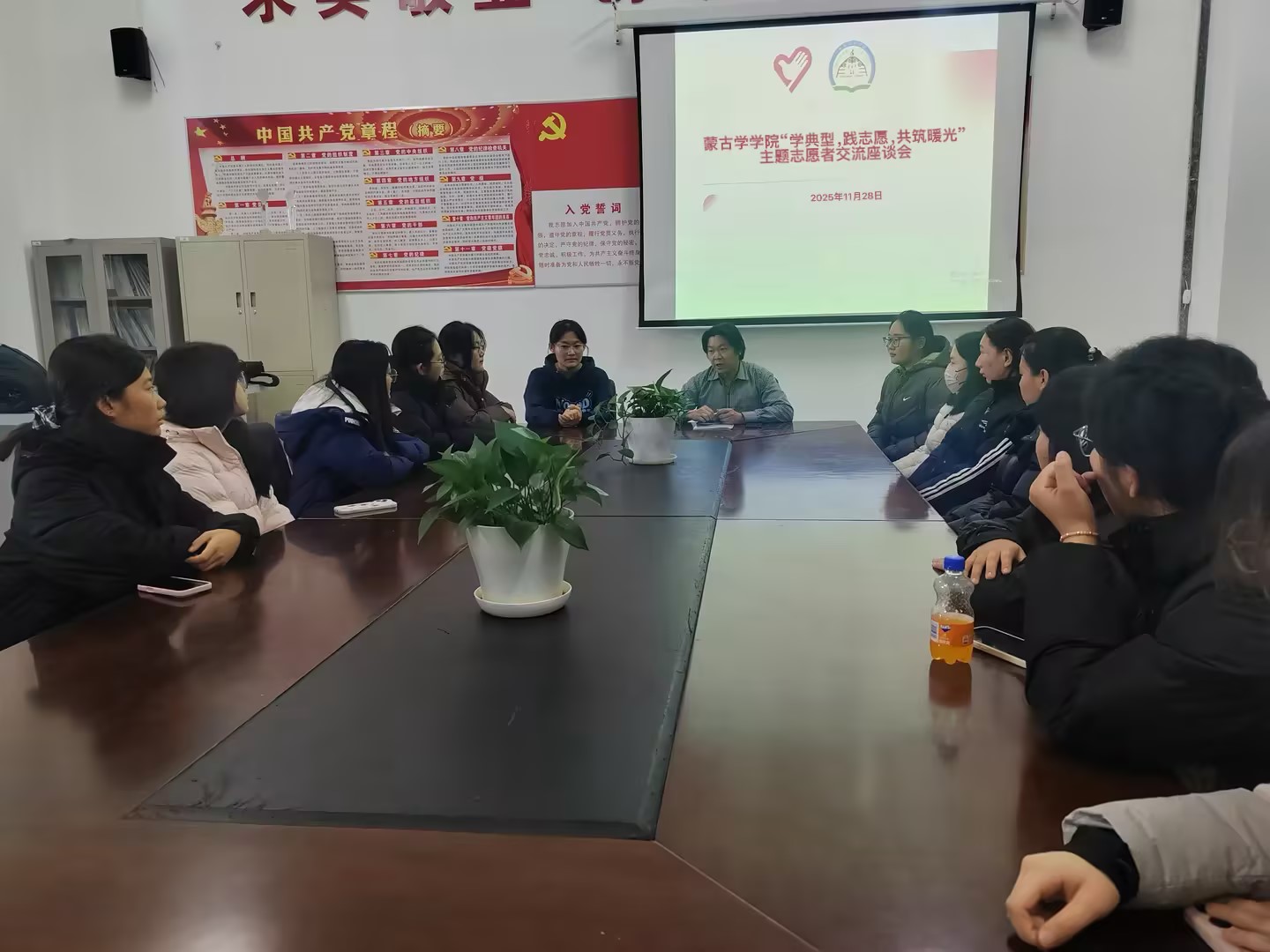 為大力弘揚志愿服務(wù)精神,凝聚青春磅礴力量,充分激發(fā)青年學(xué)子投身社會服務(wù)的熱情,11月26日,蒙古學(xué)學(xué)院在崇文樓B221會議室組織開展了“學(xué)典型,踐志愿,共筑暖光”主題志愿服務(wù)交流座談會。學(xué)院團學(xué)辦主任額爾布樂圖、優(yōu)秀志愿者代表以及各年級學(xué)生代表共計40余人參加。