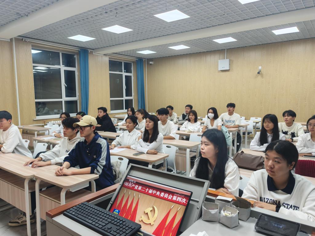 活動以“理論學習+交流分享”的形式展開:全體成員首先共同觀看中國共產黨第二十屆中央委員會第四次全體會議公報視頻,系統了解了“十四五”時期的成就與“十五五”的重要地位、發展環境以及社會發展的指導思想,為后續分享交流奠定理論基礎;隨后青馬班學員李超然、郭斯蕊、吳家樂、丁浩天、劉嘉碩、陳玲波依次登臺,結合自身專業背景、學習日常與生活實際分享個人學習感悟——既有對全會中“協同推進降碳、減污、擴綠、增長”“筑牢生態安全屏障”等內容的理解,也結合采礦專業的綠色開采技術、化學化工領域的低碳生產工藝,思考“如何將全會精神落實到學業規劃、實踐行動”,不少觀點引發了現場成員的共鳴。