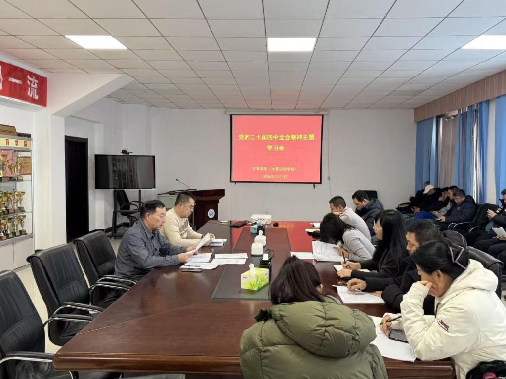 為深入學(xué)習(xí)貫徹黨的二十屆四中全會精神,精準(zhǔn)對接國家“十五五”規(guī)劃戰(zhàn)略部署,系統(tǒng)謀劃學(xué)院未來發(fā)展藍(lán)圖,12月3日下午,體育學(xué)院(冰雪運(yùn)動學(xué)院)組織全體教職工召開專題政治理論學(xué)習(xí)會,深入學(xué)習(xí)黨的二十屆四中全會精神。學(xué)習(xí)會由學(xué)院黨委書記胡日查畢力格主持,學(xué)院班子成員及全體教職工參加學(xué)習(xí)會。