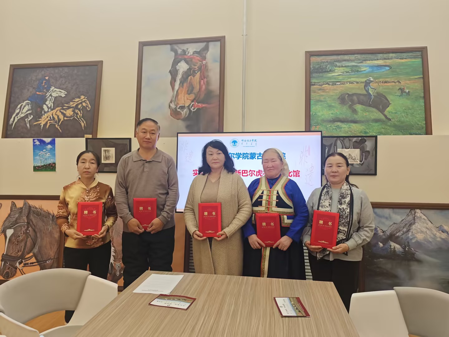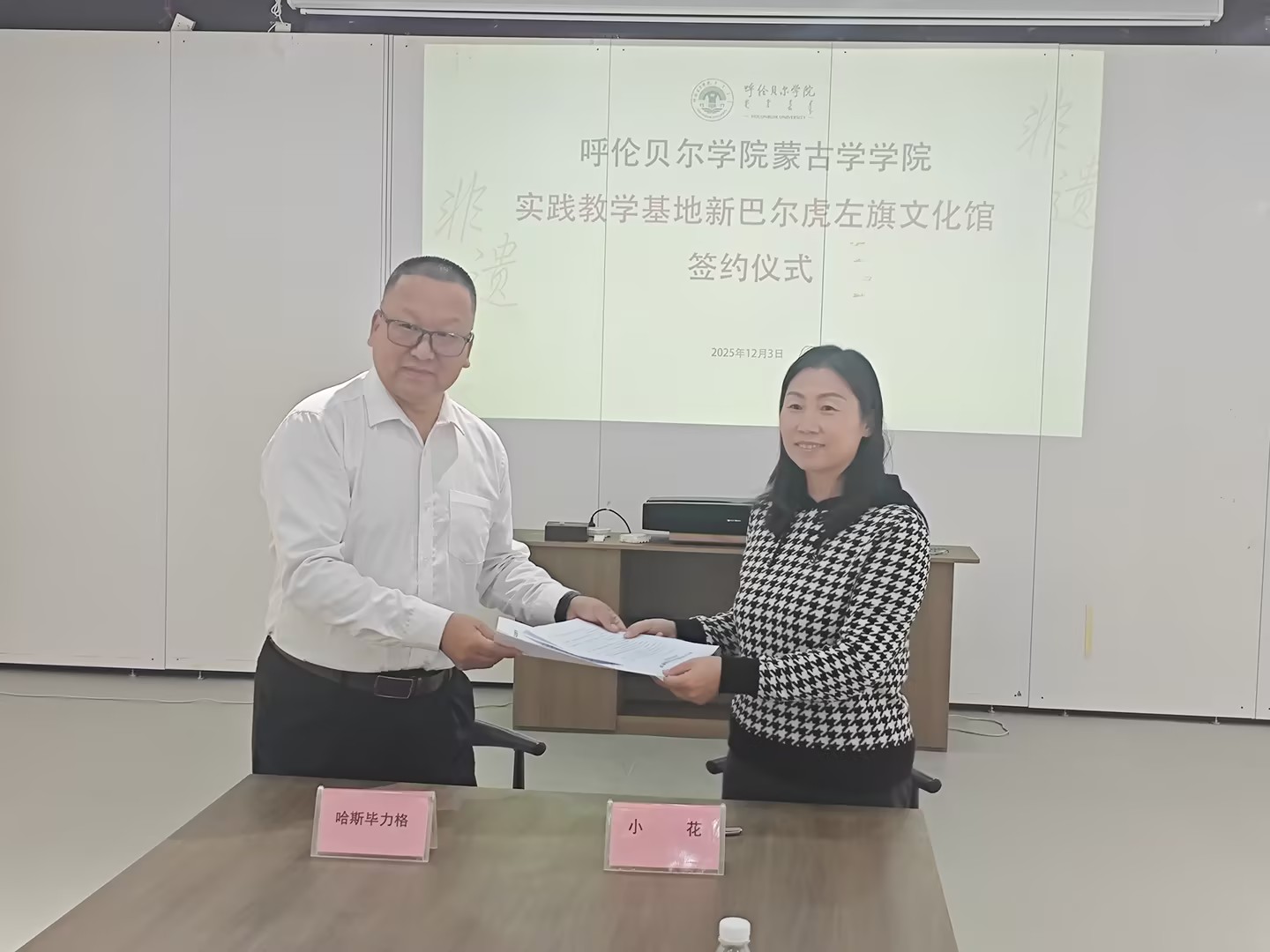 12月3日至4日,蒙古學學院副院長小花帶隊,系主任青春、教師胡斯樂、斯琴圖雅一行四人赴新巴爾虎左旗與新巴爾虎右旗,先后與新巴爾虎左旗文化館館長哈斯畢力格、新巴爾虎右旗文化館館長靈慧正式簽署實踐教學合作協議。此次行程以“校地協同、文化傳承”為核心,同步完成合作簽約與非遺傳承人聘請兩項重要工作,為實踐教學與民族優秀傳統文化傳承搭建起雙向賦能的合作平臺。