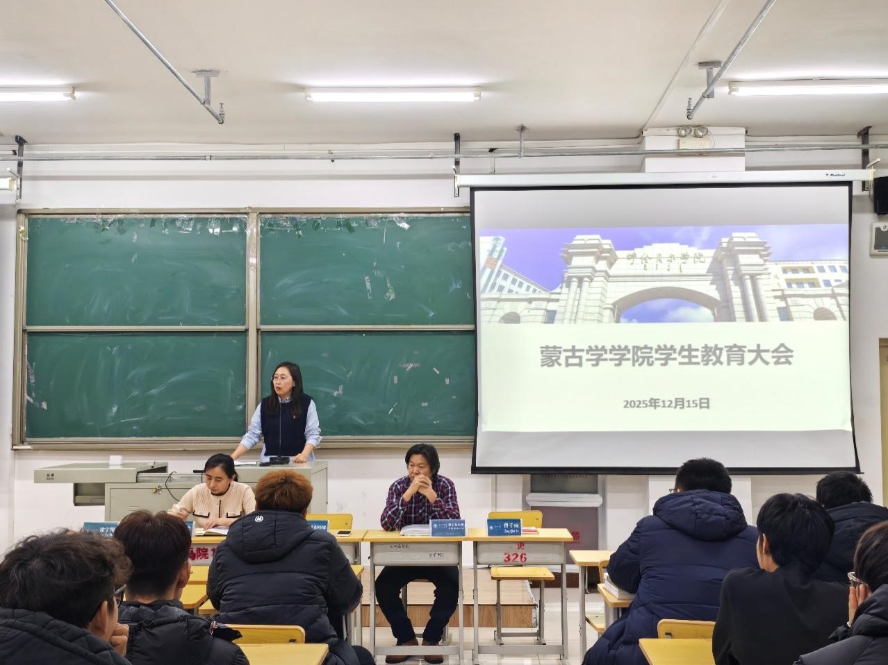 為進一步強化學生教育管理工作,增強學生的安全防范意識,推動學風建設,嚴格落實校規校紀,全力營造積極向上、和諧有序的學習與生活環境,12月15日、16日下午,蒙古學學院分別在崇文樓B201教室、401教室召開學生教育大會。學院黨委書記格根塔娜、團學辦主任額爾布樂圖、輔導員曾千雨以及全體在校生分兩批參加。會議由學院黨委副書記孔春艷主持。