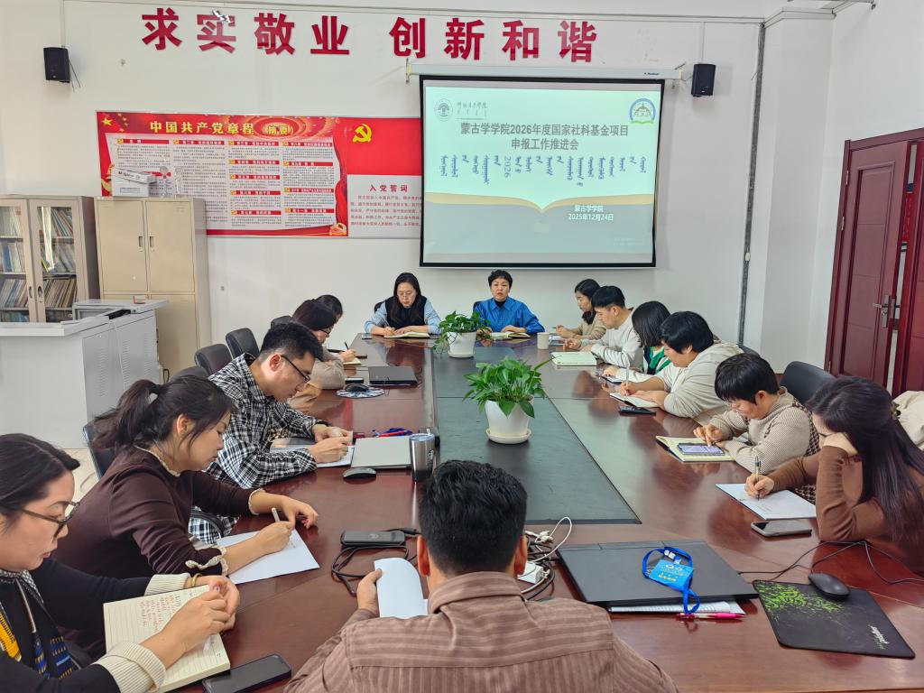 為扎實推進2026年度國家社科基金項目申報工作,提升申報質量與立項競爭力,12月24日上午,蒙古學學院在崇文樓B221會議室召開專題工作推進會。學院領導班子成員、各學科帶頭人、申報骨干教師及科研秘書等參加會議,學院院長白秀峰主持會議。